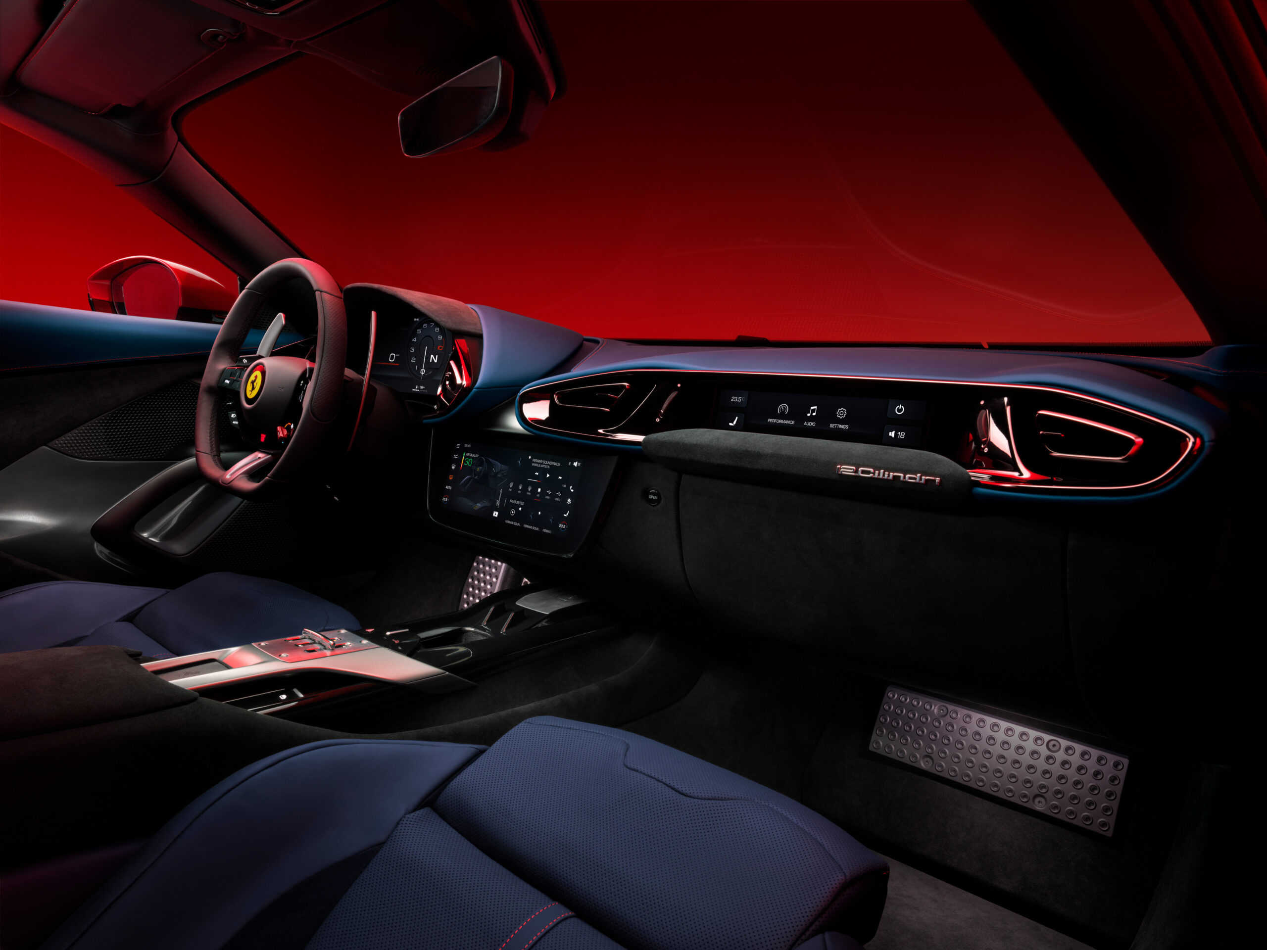 The Ferrari 12Cilindri is powered by Maranello’s iconic naturally aspirated V12, delivering 830 hp and revving to 9500 rpm. It adopts advanced solutions first seen on the 812 Competizione, including a ceramic catalytic exhaust system, titanium con rods and lightweight aluminium alloy pistons.