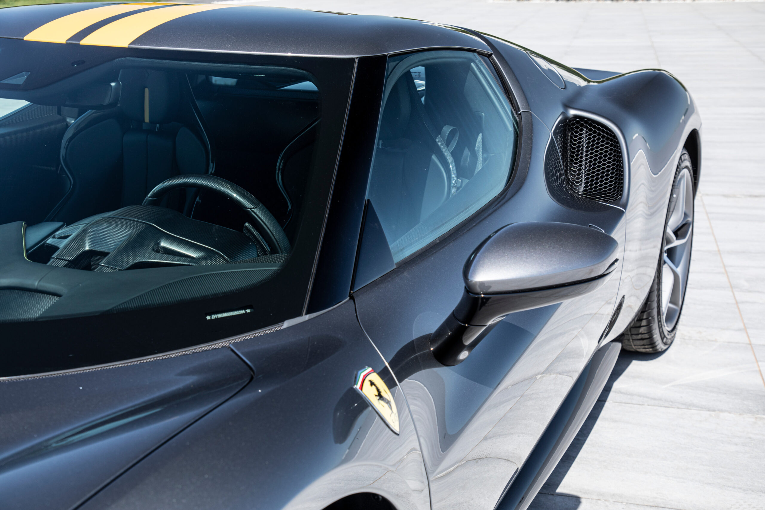 The structure of some components has been totally redesigned to save more than 12 kg. Also available, only for the Assetto Fiorano set-up, is the ultra-light rear screen in Lexan® and a livery inspired by the 250 LM. This starts with the front bumper, whose background embraces the central grille and outlines its contours, continuing first on the bonnet and then longitudinally up to the roof and rear spoiler.